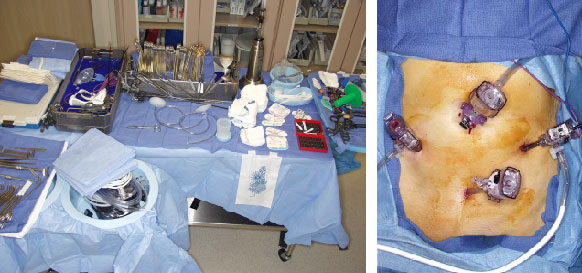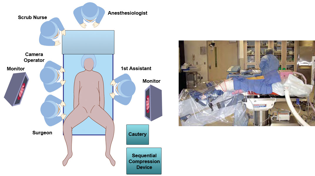 Sufficient room must be preserved around the operating table to allow monitors to be moved between the level of the patient's shoulders and ankles, in line with the surgeon's field of view, as work proceeds in different quadrants of the abdomen and in the pelvis. The laparoscopic tubing and leads are placed on the OR table and checked. The laparoscopic tower containing the light source, camera and insufflator are positioned on either right or left side to produce minimum interference with table changes and surgeon movement depending on configuration of the operating room.