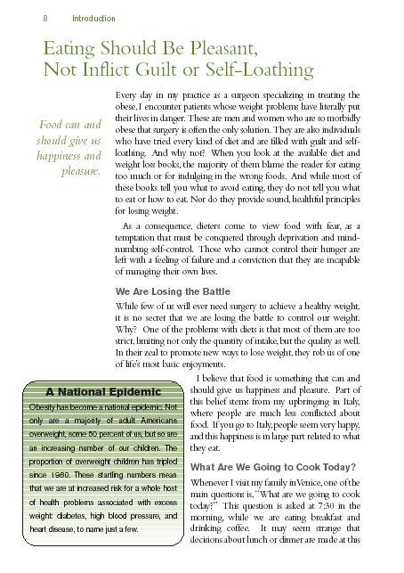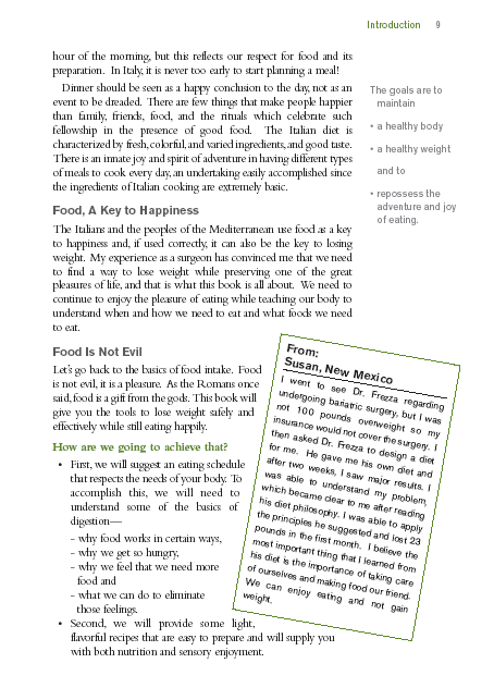 A common sense approach to weight loss using the principles of healthy eating inherent in the Italian daily diet. Nutrition, meal planning, portion control and other weight-loss strategies are discussed. Includes more than 50 of the author's own family recipes.